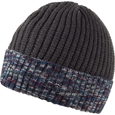 Zimní čepice s kontrastním melírovaným lemem a fleecovou podšívkou.