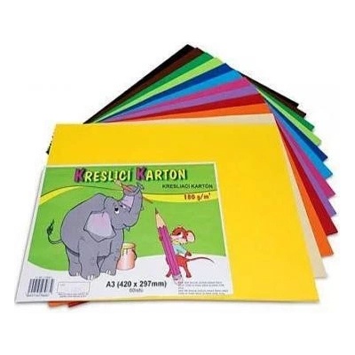 Kreslicí karton barevný. Formát: A3 (420 x 297 mm) 60 listů v balení Plošná hmotnost: 180 g/m2 Balení obsahuje tyto barvy: žlutá, krémová, oranžová, červená, fialová,...
