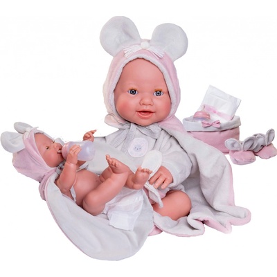 Usměvavé realistické miminko holčička, pije a čůrá, bez vlásků, mrkací oči, bez zvuku. Miminko je včetně lahvičky a když se napije, netrvá dlouho a počůrá se. Dále má dudlík a plenku. Tělíčko je z měkčeného vinylu, který je velmi příjemný na dotek a na kterém je...