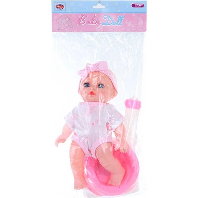 Miminko s doplňky. Miminko po vložení baterií vydává zvuky a čůrá. Balení obsahuje také plenku, nořník a lahvičku. Napájení na 3 AG13 baterie (jsou součástí balení). Rozměry miminka cca 28 x 11 cm. Ro