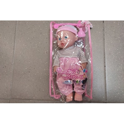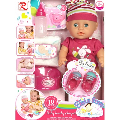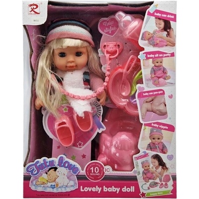Miminko s doplňky. Panenka po vložení baterií vydává zvuky a čůrá. Balení obsahuje také botičky pro panenku, plastový bryndáček, lahvičku, talířek a další doplňky. Napájení na 3 AG13 baterie (jsou sou