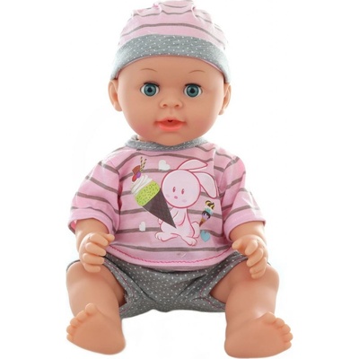 Miminko s doplňky. Miminko po vložení baterií vydává zvuky a čůrá. Balení obsahuje také talířek, lžičku, nořník a lahvičku. Napájení na 3 AG13 baterie (jsou součástí balení). Rozměry miminka cca 30 x 11 cm. Rozměry balení cca 23 x 30 x 12 cm. Věk 3+