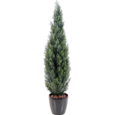 Umělý strom CYPŘIŠ JUNIPERUS má celkovou výšku včetně kotvícího květináče 105cm a na šířku 57cm. Cypřiš stálezelený má kmen ze dřeva + fibre a dva tóny zeleného jehličí z PE....