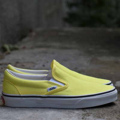 Stylové nazouvací tenisky Vans Classic Slip-On jsou neonově žluté barvy a vypadají skvěle. Z boku mají bílou cedulku, na které je černý znak Vans. Na podrážce je červená...