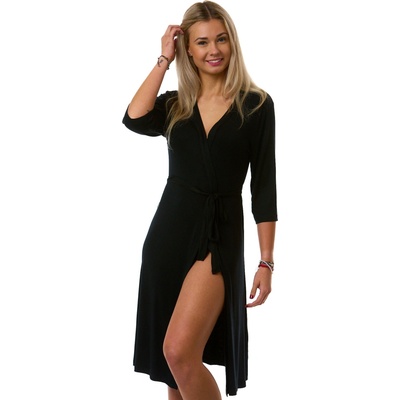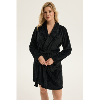 Černý dámský župan z lehkého, hebkého a extra pružného materiálu. Klasicky zavazovací s páskem, skvěle padne a dodá pocit luxusu.