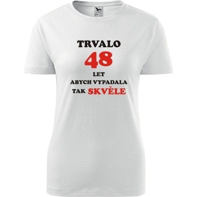 Bílé dámské tričko trvalo 48 let. nabízené velikosti jsou S,M,L,XL,XXL. Výběr z 12ti barev. Tričko patří do kategorií Dárek pro ženu k 48, . Technologie potisku: Tisk na tričko...