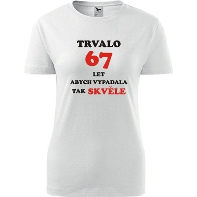 Bílé dámské tričko trvalo 67 let. nabízené velikosti jsou S,M,L,XL,XXL. Výběr z 12ti barev. Tričko patří do kategorií Dárek pro ženu k 67, Dárek pro babičku, . Technologie...