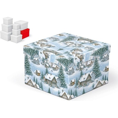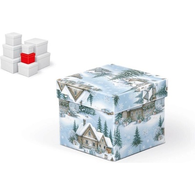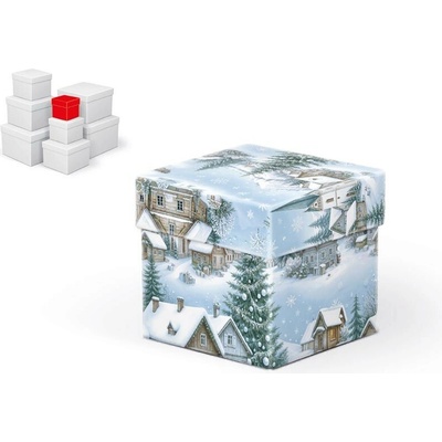 Vánoční dárková krabice o rozměrech 10 x10 x 9 cm Krabička s nostalgickým motivem zasněžené vesničky, stromky a jemnými sněhovými vločkami vnese do balení kouzelnou atmosféru...