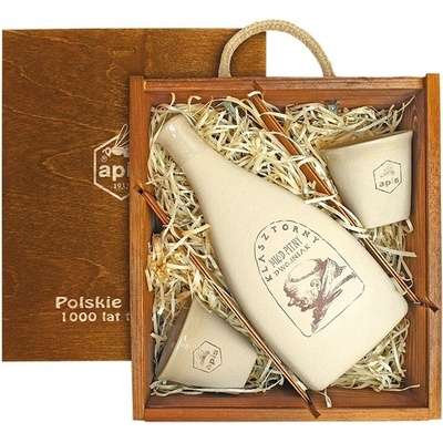 Medovina Klasztorny Dwójniak v 0,5 l kamenina + 2x engoba kameninové kalíšky v béžové dřevěné dárkové krabici Medovina Klasztorny Dwójniak v 0,5 l kamenina + 2x engoba...