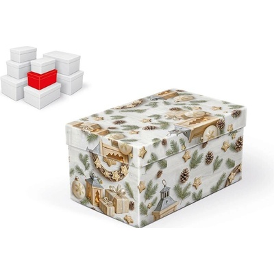Vánoční dárková krabice o rozměrech 18 x 11 x 9 cm Vánoční dárková krabička s motivem přírodních dekorací, šišek a zlatých ozdob je krásným řešením pro každého, kdo chce mít...