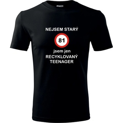 Dárky pro muže k 81. Černé tričko jsem recyklovaný teenager 81. Nabízené velikosti jsou S, M, L, XL, XXL, XXXL. Výběr z 12 barev. Tričko patří do kategorií Dárek pro muže k 81....