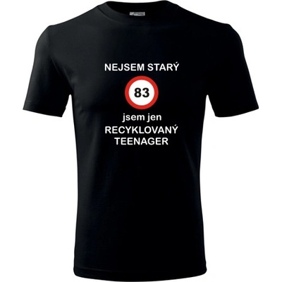 Dárky pro muže k 83. Černé tričko jsem recyklovaný teenager 83. Nabízené velikosti jsou S, M, L, XL, XXL, XXXL. Výběr z 12 barev. Tričko patří do kategorií Dárek pro muže k 83....