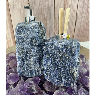 Dávkovač na mýdlo a difuzér vyrobené ze surového sodalitu. Luxusní výzdoba každé koupelny. Kupujete přímo vybrazený pár. Dodáváno bez mýdla a bez náplně do difuzéru. Kupujete...