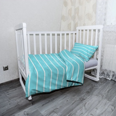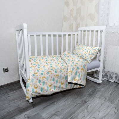 Dětské bavlněné povlečení do postýlky s milým dětským motivem koček v modrých, šedých, tyrkysových a oranžových barvách na bílém podkladu. Je ušité z hustě tkaného 100%...