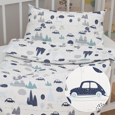 Dětské bavlněné povlečení do postýlky s milým dětským motivem modrých aut mezi stromy na bílém podkladu. Je ušité z hustě tkaného 100% bavlněného plátna s certifikátem zdravotní...