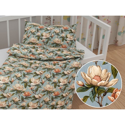 Dětské bavlněné povlečení do postýlky se vzorem květů magnolie na šedomodrém podkladu. Je ušité z hustě tkaného 100% bavlněného plátna s certifikátem zdravotní nezávadnosti...