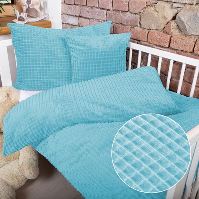 Dětské hřejivé povlečení do postýlky s 3D kostičkovým vzorem v světle modré barvě. Je ušité z plyšově hebké a hřejivé polyesterové látky Minky s certifikátem zdravotní...