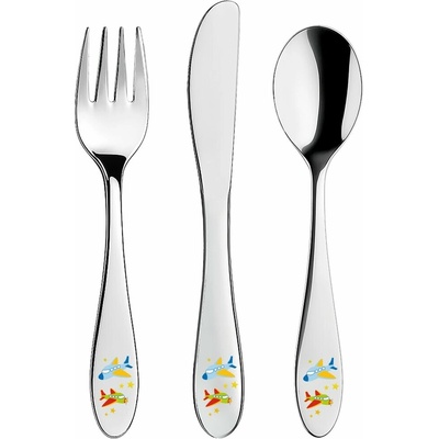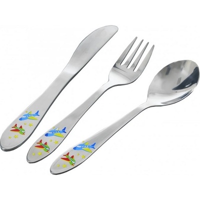 Druh nádobí: příbor Určení: pro kluky Provedení výrobku: nerez Dětský příbor s barevným dekorem letadel pro kluky. Obsahuje 3 ks - lžíci, vidličku a nůž. * tvar přizpůsobený...