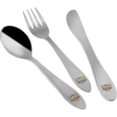 Dětský příbor s barevným dekorem KOCOUŘI. Obsahuje 3 ks - lžíci, vidličku a nůž. Materiál: kvalitní nerez. Tvar přizpůsobený dětem. Lze mýt v myčce na nádobí, ale nedoporučujeme, mohlo by dojít k poru