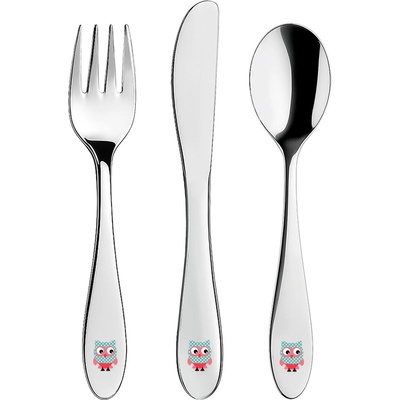 Dětský příbor s barevným dekorem sovy. Obsahuje 3 ks - lžíci, vidličku a nůž. Materiál: kvalitní nerez. Tvar přizpůsobený dětem. Lze mýt v myčce na nádobí, ale nedoporučujeme, mohlo by dojít k porušení barevného dekoru, což později nemůže být důvodem reklamace....