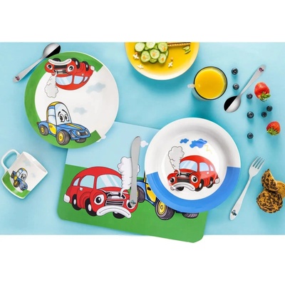 Dětský příbor s barevným dekorem AUTO. Obsahuje 3 ks - lžíci, vidličku a nůž. Materiál: kvalitní nerez. Tvar přizpůsobený dětem. Lze mýt v myčce na nádobí, ale nedoporučujeme, mohlo by dojít k porušení barevného dekoru, což později nemůže být důvodem reklamace....
