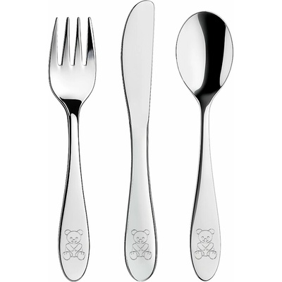 Dětský příbor s dekorem medvídka. Obsahuje 3 ks - lžíci, vidličku a nůž. Materiál: kvalitní nerez. Tvar přizpůsobený dětem. Lze mýt v myčce na nádobí. Rozměry: (délka/šířka) lžíce 15,5/3,5 cm, vidlička 15,5/2,5 cm, nůž 17/2 cm.
