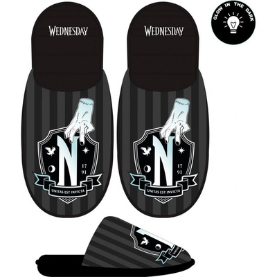 Pantofle Wednesday Nevermore Academy. Oficiálně licencovaný produkt. Velikosti jsou uvedeny v tabulce na obrázku. Gumová podrážka.
