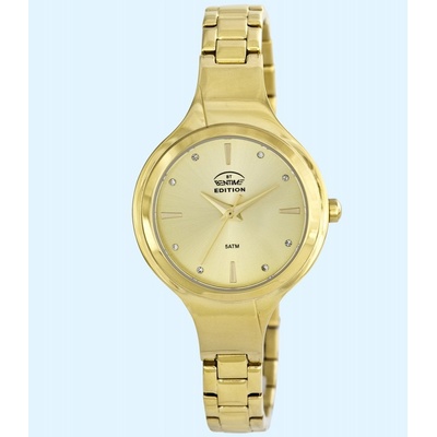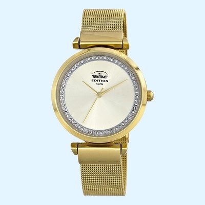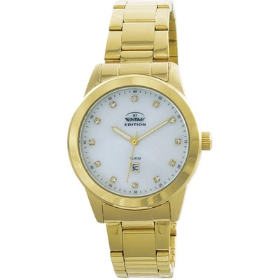 Bentime Edition E029-1K93FBB Pouzdro: ocel zlaceno se zirkony Řemínek: ocel zlaceno Ciferník: zdobený zirkony Sklo: minerální tvrzené Vodotěsnost: 30 m Chod: baterie quartz Funkce: čas,vteřinová ručička mimo střed Rozměr: 38 x 9,4 mm Šroubovací víčko