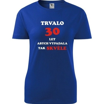 Modré dámské tričko trvalo 30 let. nabízené velikosti jsou S,M,L,XL,XXL. Výběr z 12ti barev. Tričko patří do kategorií Dárek pro ženu k 30, Dárek pro manželku, . Technologie...