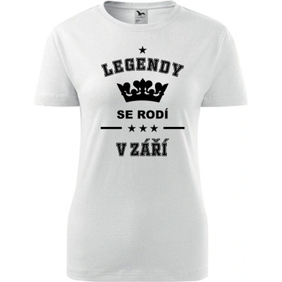 Bílé dámské tričko Legendy se rodí v září. nabízené velikosti jsou S,M,L,XL,XXL. Tričko je zařazeno v sekcích Dárek pro ženu k 29, Dárek pro ženu k 56, Dárek pro ženu k 65,...