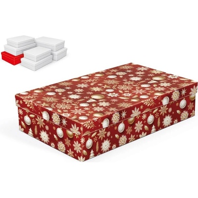 Vánoční dárková krabice o rozměrech 34 x 22 x 8 cm Prostorná vánoční dárková krabice v červeném provedení se zlatými a bílými motivy vloček, hvězd a ozdob dodá každému daru...