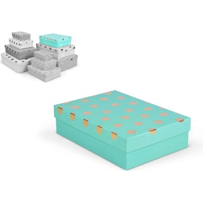 Celoroční dárková krabice o rozměrech 27,5 x 19,5 x 7,5 cm NÁHODNÝ MIX Dárková krabice v mixu barev se zlatými puntíky. Vhodná pro slavnostní příležitosti, dekorativní účely,...