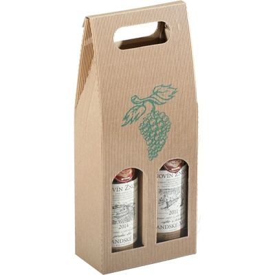 Velmi kvalitní pevná krabice v přírodní hnědé barvě s tradičním motivem (zelený potisk hroznu), ideální obal pro dárkové balení dvou lahví vína. Materiál: 4-vrstvá mikrolepenka,...