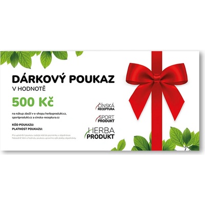 Dárkový poukaz v hodnotě 500,- Kč na nákup produktů v e-shopech HERBAPRODUKT.CZ, CINSKA-RECEPTURA.CZ a SPORTPRODUKT.CZ