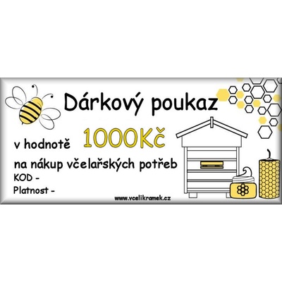 Dárkový poukaz na nákup včelařských potřeb a dalšího zboží v hodnotě 500Kč. Poukaz je opatřen unikátním kódem, který zadáte při nákupu v košíku a částka vám bude...