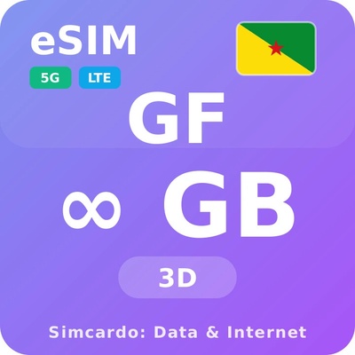 Mobilní Internet pro Francouzskou Guyanu s 3GB platný na 30 dní. Získejte rychlý a spolehlivý internet v Francouzské Guyaně s okamžitou aktivací travel eSIM. Okamžité doručení...