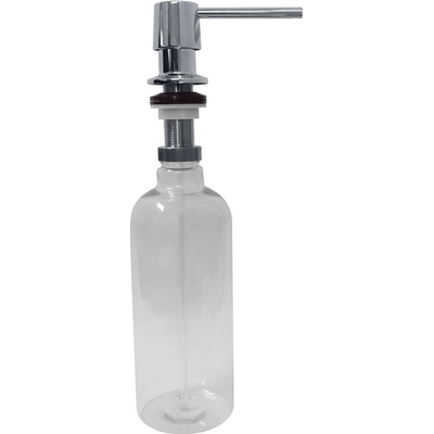 Dávkovač mycího prostředku zabudovaný do desky nebo dřezu Popis : - kovová hlavice - lesklý chrom - spodní nádobka - průhledný plast.