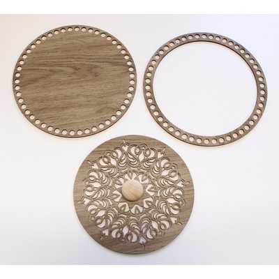 Materiál: HDF deska ,dekor jednostranně dekorované . Sada na háčkovaný košík Sada obsahuje 1.dno průměr je 22,5 cm 2.prstenec o pruměru 22.5 cm 3 . víko 20cm + knopka se...