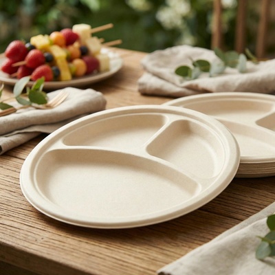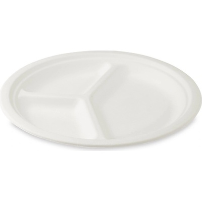 třídílný kulatý talíř vyrobený z cukrové třtiny je biologicky rozložitelný, lehký a přesto velmi pevný. Talíř je odolný proti vodě i tukům, nepromastitelný a vhodný pro ohřev...