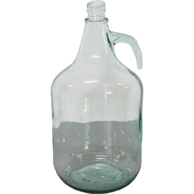 Skleněný demižon s umělohmotným podstavcem o objemu 5 litrů.