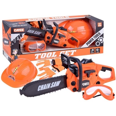 Dětská motorová pila s ochrannými brýlemi pro malého dřevaře. Motorová pila má zvuk jako skutečná!