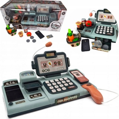 Dětská elektronická pokladna s doplňky pro každý správný obchod. Obsahuje: funkční kalkulačku s displejem, otevírací zásuvku s penězi a světlem a zvukem u čtečky čárových...