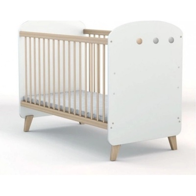 Moderní dětská postýlka s čely vyrobenými z laminované dřevotřísky a s nožičkami, bočnicemi a s roštem z masivu. Povrchová úprava "Baby Friendly" zajišťuje, že když se dostane...