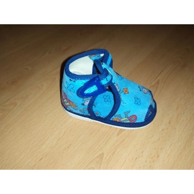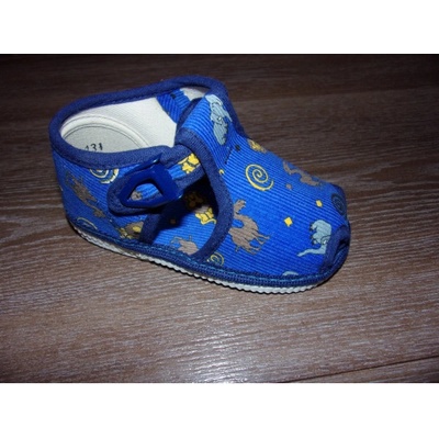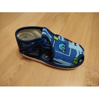 Dětské bačkory Bighorn FILIP v modré barvě s motivem dinosaura na špičce. Svrchní část obuvi je vyrobena z vysoce kvalitní bavlny a podešev obuvi z PVC. Stélka bačkor je z...