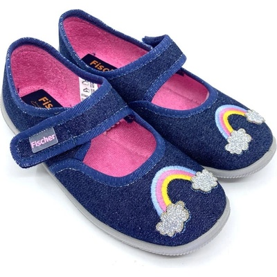 Džínové dívčí baleríny Fischer 632242 s výšivkou duhy sednou na úzké nožky. Podšívka je z růžového, bavlněného froté. Bačkory jsou velmi ohebné všemi směry, mají zpevněný opatek...
