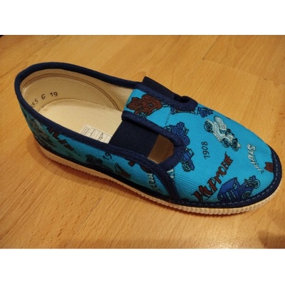Chlapecké sandálkové plátěnky, které jsou ušity z tlustší tkané textilie tmavě modré barvy. Je bohatě potlačena. Potisk