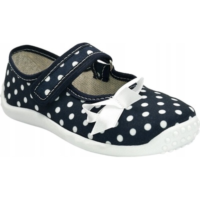 Dětské baleríny Bighorn JANA v černé barvě s bílými puntíky a designovou mašličkou na špičce. Svrchní část obuvi je vyrobena z vysoce kvalitní bavlny a podešev obuvi z PVC....