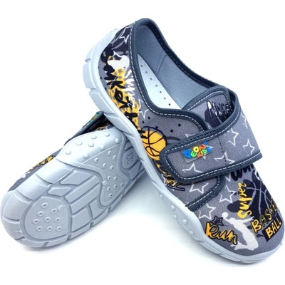 Dětské bačkory Peon MI/019 ER vyrobené z bavlněné tkaniny v šedé barvě a basketbalovými motivy. Jsou vhodné na normálně široké nožky a díky suchému zipu se dají krásně...
