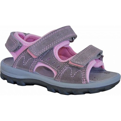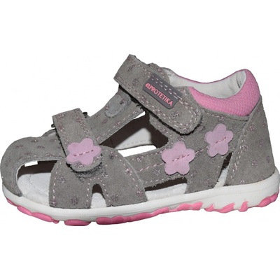 Sandály Protetika s šedým svrškem jsou ozdobeny růžovými kytičkami. Chodidla v nich budou dobře sedět díky plnému opatku a suchému zipu přes nárt. Mají i částečně uzavřenou...