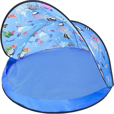 PARADISO - Stan se stříškou modrý - rybičky. Praktický stan se stříškou pro nejmenší děti modrý s potiskem rybiček. Stan se snadno rozkládá, dodává se společně s taškou na zip...